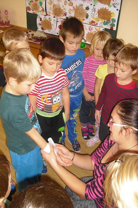 V pátek, 13. 11. 2015, si děti povídaly se zdravotní sestrou paní K. Perníčkovou o úrazech, které se nám mohou přihodit venku i doma. Mnohé maminky se odpoledne polekaly, když uviděly tolik obvázaných rukou ...