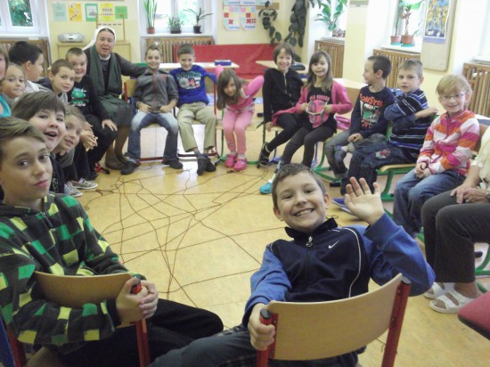 Dnes jsme společně vyrobili "pavučinu přátelství". Je to příležitost seznámit se s novými žáky, rozkoukat se ve škole a třeba se i něco víc dozvědět o paní učitelce....Všichni slíbili, že si budou celý rok pomáhat, abychom byli "šťastná" škola.